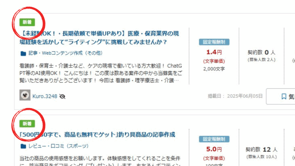 新着案件は、まだ多くのライターに見られていない可能性が高いため、競争率が低いです。